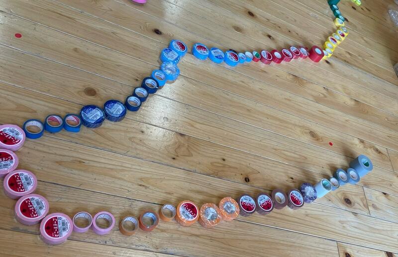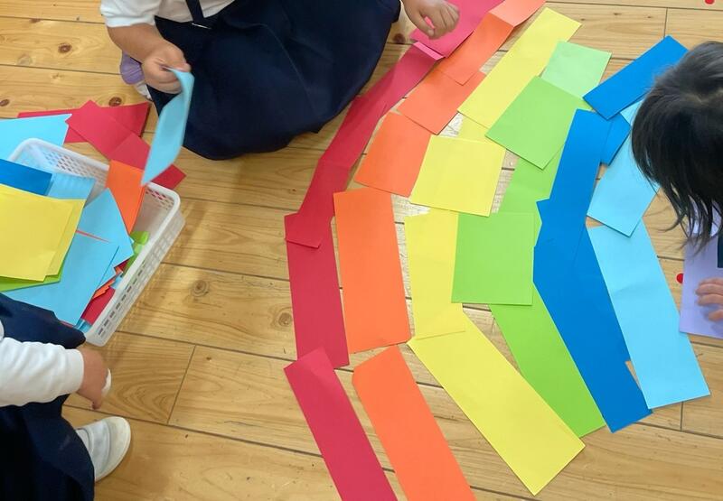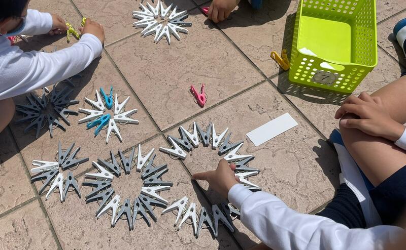 図工の時間に、算数ボックスに入っているおはじきやブロックなどを自分の机の上に並べて遊びました。物の数や色や形のきまりを自分で考えながら「並べる」ことの理解を深めました。その後、4人グループになってせんたくばさみ・ストロー・折り紙などを並べて遊びました。出来上がった作品を見て回りながら、それぞれのグループの並べ方の良さに気づき「すご~い」「きれい!」と歓声を上げていました。