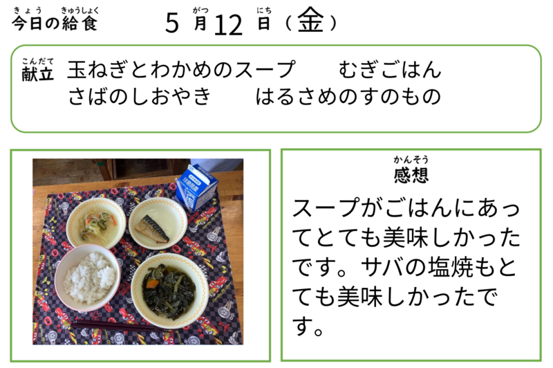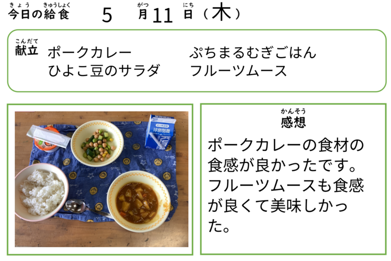 連休後の給食でした。久しぶりに食べた給食はおいしかったです!!
