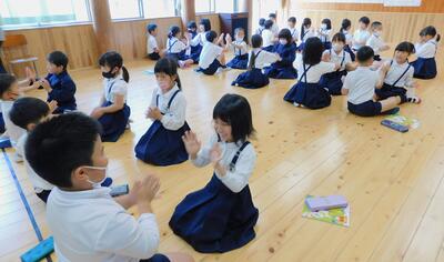 2時間目に2年生が「ロンドン橋」の曲に合わせて手遊びをしていました。