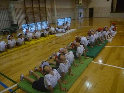 ネコちゃん体操をしながら、マット運動に必要な体の動きを身につけています。