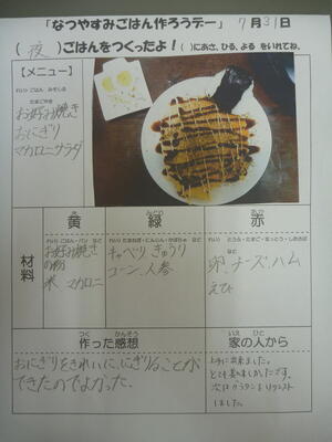 今回は夏休みということもあり、朝食に限らないということと2枚のカードを配らせてもらいました。少しずつ子どもたちの腕が上がっていることに微笑ましく思ったところでした。保護者の方には、お忙しいところ取り組んで頂き大変ありがとうございます。子どもたちの健康な食生活のためにも、これからもどうぞよろしくお願いいたします。