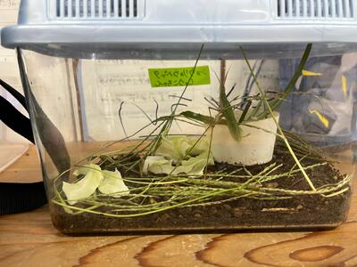 今週から、グループごとに虫かごで育ててみようということで、住みかを作って観察をしています。