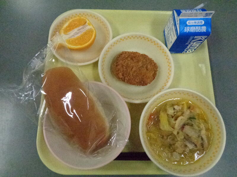 「熊本の味」の特別メニューで、コッペパン、タイピーエン、馬肉コロッケ、デコポン、牛乳 でした。