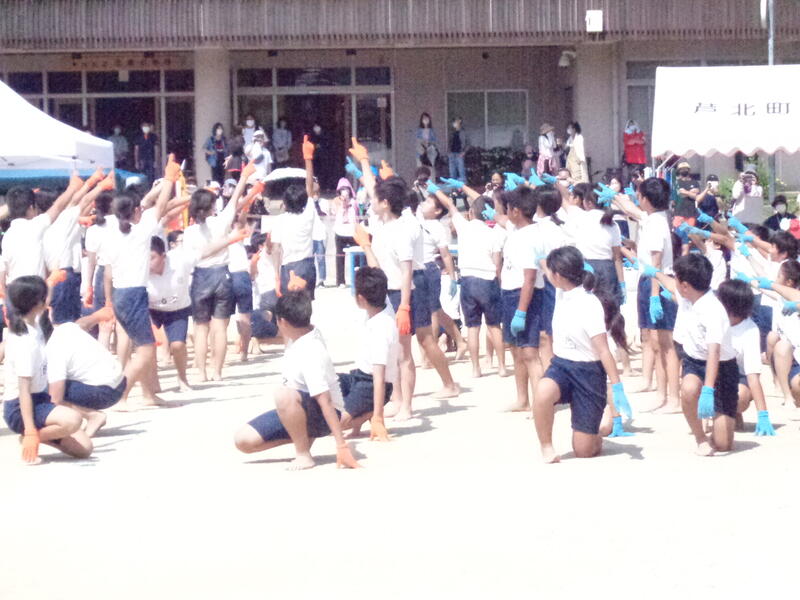 3,4年生の表現、ソーラン節ではカラフルなはっぴをなびかせて颯爽と駆け回り、かっこいい姿を披露することができました。しっかりと腰を落として、気合の入った掛け声で漁をし、今日は今までにないほどの「大漁」でした。