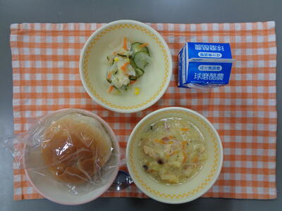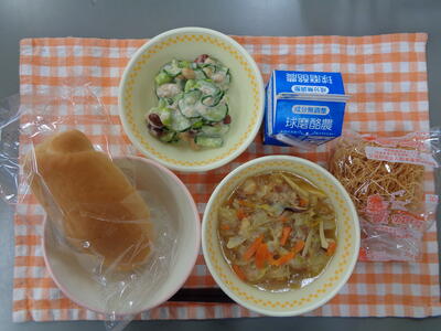 献立:コッペパン、かぼちゃポタージュ、イタリアンサラダ、チョコタッフィー
