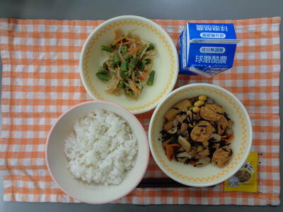 献立:麦ごはん、がんもとひじきの煮物、いんげんのごま和え、のりたまふりかけ、牛乳