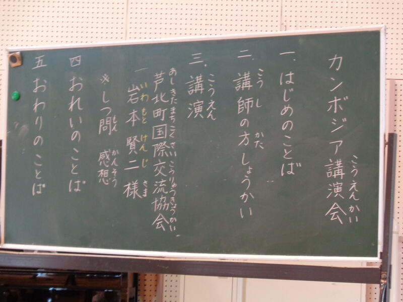 カンボジアという国の紹介や子供たちの現状などを、1,2年生と3,4年生に分かれ講師の方に話していただきました。