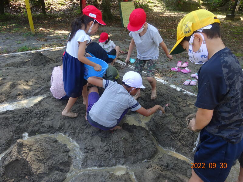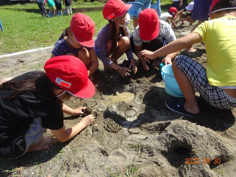 砂を積んだり、掘ったり、丸めたり、砂に水を加えて泥にしたりなどして思い思いの作品をつくりました。そして自分の作品と友達の作品を溝でつなぎ、水を流して川に見立てた児童もいました。