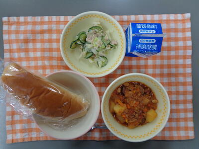 献立:パインパン、肉団子と白菜のクリーム煮、ちりめんサラダ、スイートスプリング、牛乳