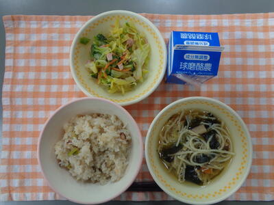 献立:たこ飯、魚そうめん汁、ブロッコリーのシモン和え、牛乳