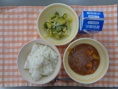 献立:麦ごはん、根菜カレー、ちぐさ和え、牛乳