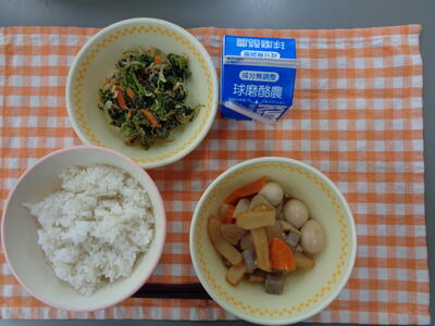 献立:麦ごはん、おでん風煮、野菜のおかか和え、牛乳