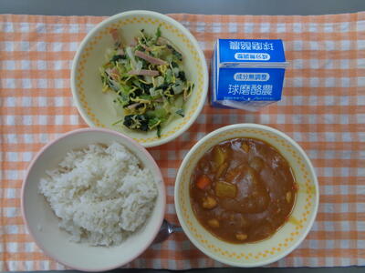 献立:麦ごはん、根菜カレー、ちぐさ和え、牛乳