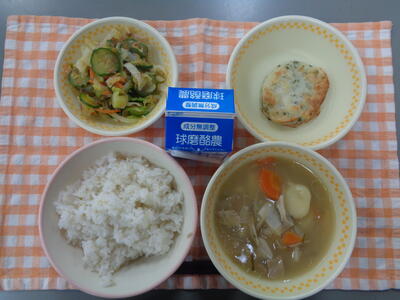 献立:麦ごはん、うったち汁、いかねぎ焼き、キャベツのうめドレッシングあえ、牛乳