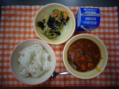 献立:ぷちまるむぎごはん、やさいカレー、ちりめんサラダ、牛乳