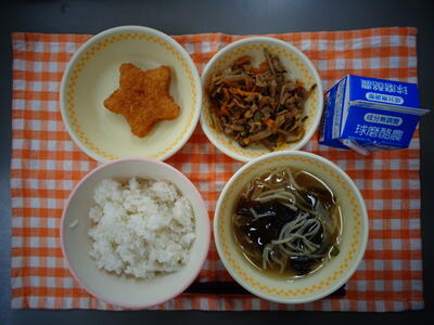 献立:麦ごはん、七夕汁、星形コロッケ、豚肉のピリ辛炒め、牛乳