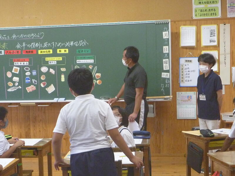 9月16日(木)5年生の家庭科では「なぜいろいろな食品を食べるのか考えよう」というテーマで、授業が行われました。まず、タンパク質・無機質・炭水化物・脂質・ビタミンの5つの栄養素について知り、どの食品がその仲間に入るのかをみんなで分類しました。授業の後半では、「ご飯と豆腐の味噌汁」に、何を付け加えればバランスのとれた食事になるか、一人一人がシートに書き込みながら考えました。給食センターの本井先生に助言して頂ぎながら、5つの栄養素をうまく取り入れたメニューに仕上がりました。
