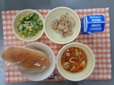 献立:ミルクパン、ミネストローネ、とりにくのマーマレード煮、グリーンサラダ、牛乳