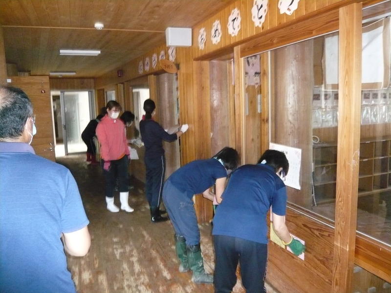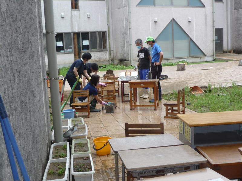 雨が上がった午後からは、浸水した低学年教室の机や椅子を水洗いして拭き取る作業を行いました。