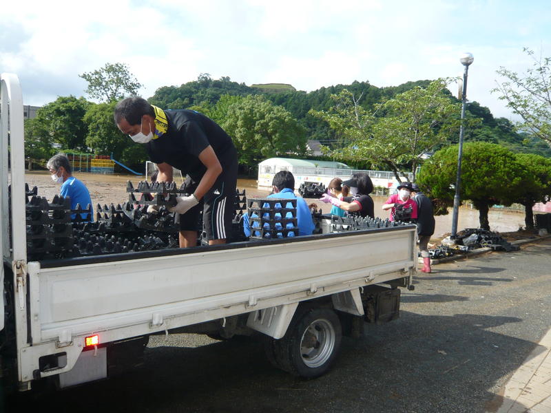昨日とうってかわって、また雨模様の一日でした。この日も昨日に続き、体育館周辺の流木やゴミを集めて搬出する作業を雨に濡れながら行っていただきました。