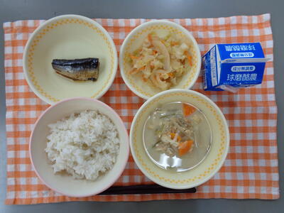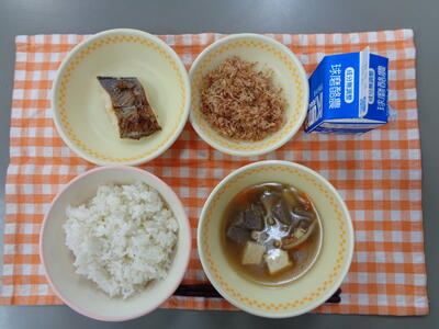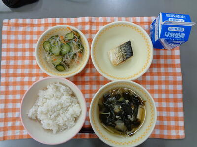 献立:むぎごはん、すまし汁、さばの塩焼き、はるさめのすのもの、牛乳