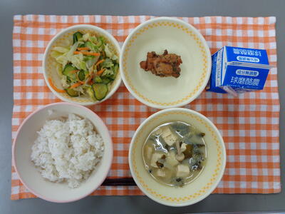 献立:むぎごはん、たまねぎのみそ汁、ちりめんサラダ、鶏のお茶揚げ