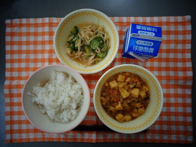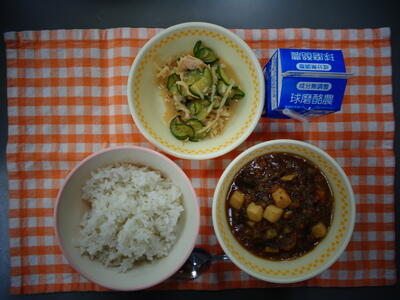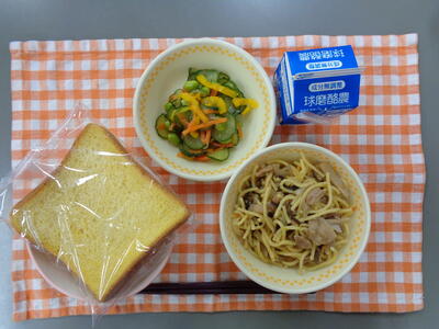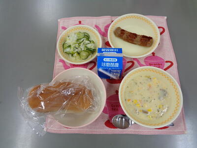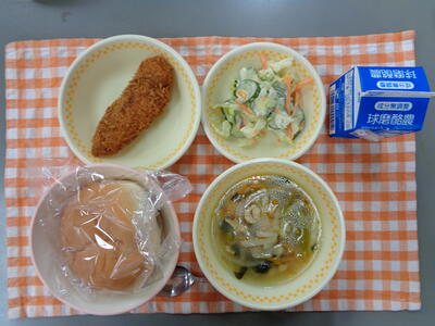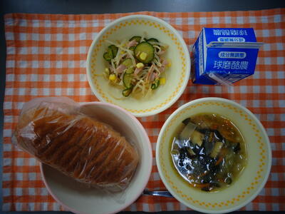 献立:ミルクパン、中華スープ、きゅうりのぴりから、焼き餃子、牛乳