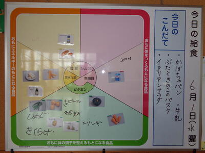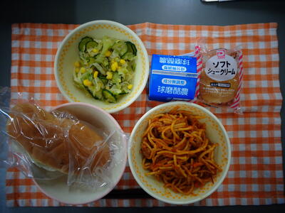 献立:かぼちゃパン、ぶたときのこのパスタ、イタリアンサラダ、牛乳