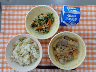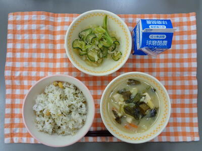 献立:大豆高菜ご飯、具だくさんみそ汁、キャベツのじゃこあえ、牛乳
