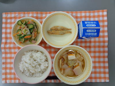 献立:麦ごはん、あおさ汁、きびなごフライ、ツナサラダ、牛乳
