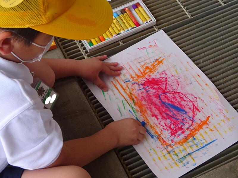 クレパスをこすって形や線に表す活動を行いました。クレパスを指やティッシュでこすって伸ばし、優しい感じのする絵に仕上げました。子ども達は、「わあ、きれいだね」「おもしろ~い」と言いながら思い思いの世界を表現していました。
