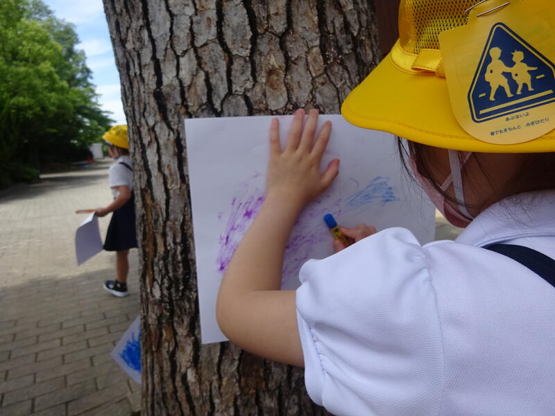 1年生の図工では、凸凹したところを探して、そこに画用紙を重ねてクレパスで色を塗って楽しみました。