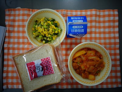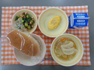 献立:コッペパン、ラビオリスープ、トマトミートオムレツ、ビーンズサラダ、牛乳