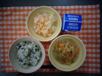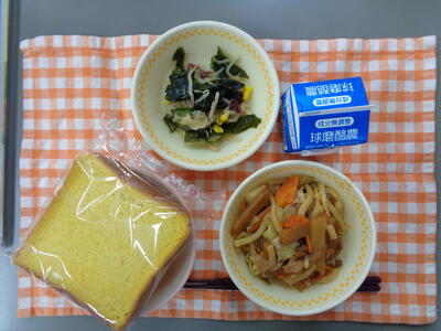 献立:わかめごはん、タイピーエン、フルーツヨーグルト、牛乳