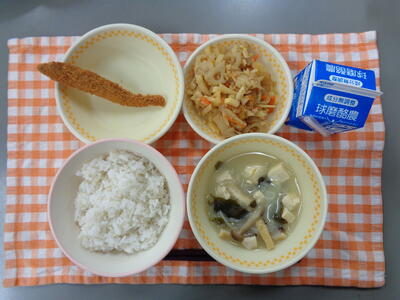 献立:とりごぼうピラフ、コンソメスープ、ししゃもフライ、牛乳