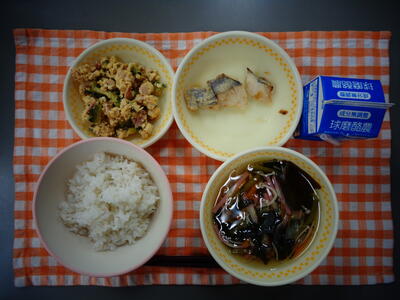 献立:麦ごはん、南関あげの卵とじ、ふしそうめんサラダ、ジューシー、牛乳