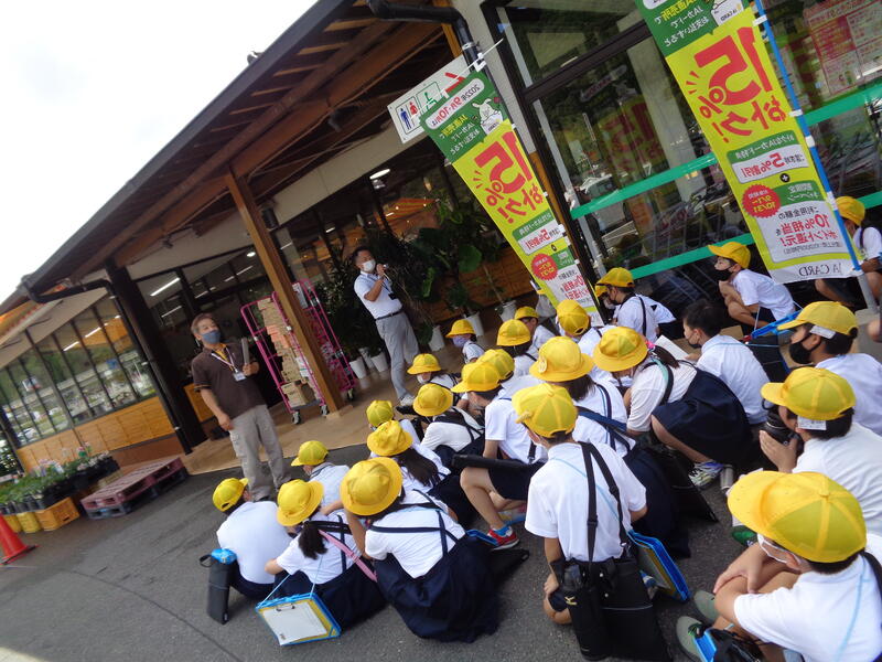 副店長さんに一通り説明していただいた後、4,5人のグループに分かれて店内を見学したり、工夫を見つけて写真に撮ったりしました。季節感を大切にした商品展示や芦北の特産品の手作り広告等、たくさんの工夫を見つけて感動していました。見学の後、質問タイムをとっていただき、子どもたちからの質問に丁寧に答えていただきました。とても充実した学習ができました。