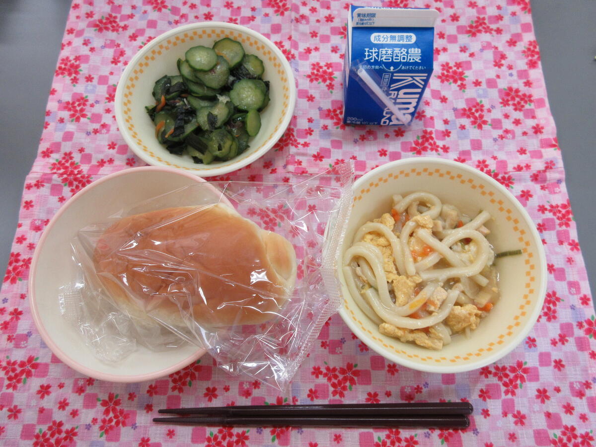 今日の給食は、親子うどん、青しじそ海藻サラダ、ミルクパン、牛乳でした。