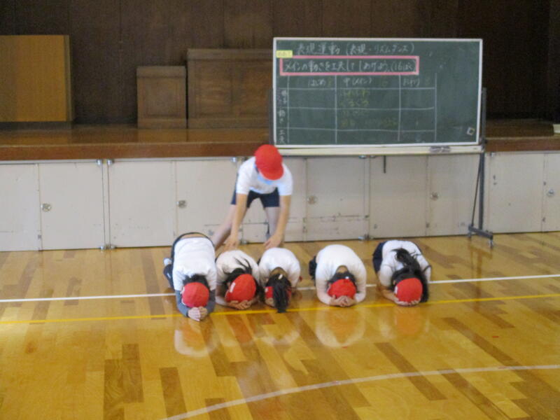 体育では、表現運動をしています。「たこやき」や「からあげ」など、食べ物を作る過程を全身で表現しています。グループごとに自分たちで決めたテーマに沿って、転がったりクルクル回ったり大笑いしたりしながら楽しく活動しています。来週発表予定です。
