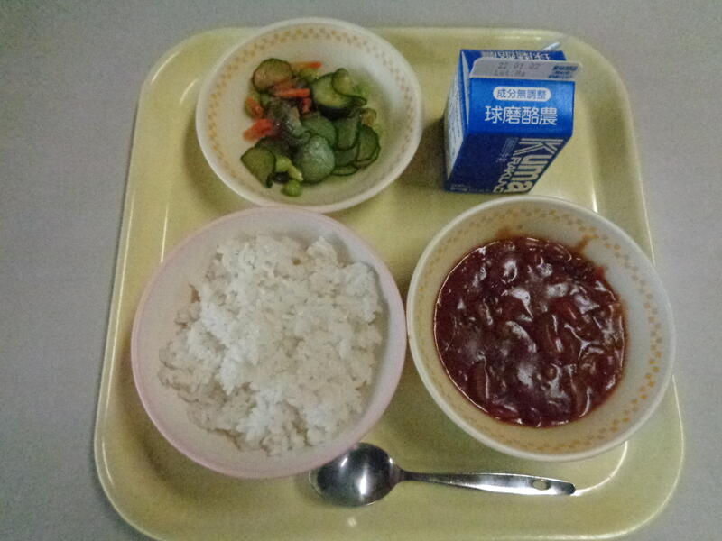 今日の給食は、ふるさとくまさんデーで、菊池・山鹿地区の味めぐりです。雑穀米は、食物繊維がたっぷり入っています。武光公鍋とは、650年前に戦鍋として食べられていたものです。菊池一族の当主の武光が弓で射ったカモを鍋の具材として調理したことから武光公鍋という名前になりました。給食ではカモの代わりに鶏肉を使用しています。