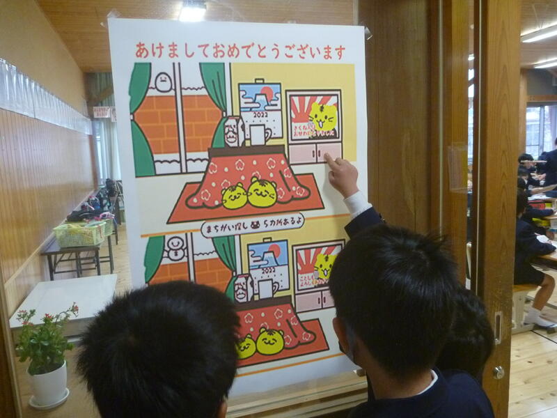 冬休みの間、しんと静まり返っていた学校に子ども達の元気な姿が帰ってきました。今日は3学期の始業式、子ども達へのお年玉代わりに、3年生の廊下には3つの楽しいゲームが掲示されました。「トラのあみだくじ」「トラの迷路」「間違い探し絵」さて、どれから始めようかな。「間違い探し」と「トラのあみだくじ」はすぐに答えがわかったけど、「トラの迷路」は難しい・・・。友達と確かめ合いながら何度もチャレンジしてみます。