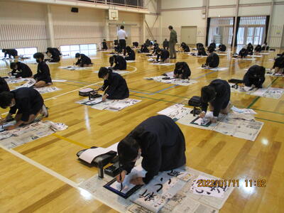 3学期がスタートした5年生は、体育館に全員集合して書き初めをしました。