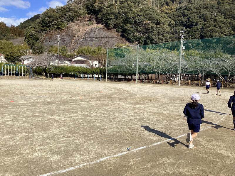 2年生は、体育で、持久走の練習で鬼遊びを行っています。