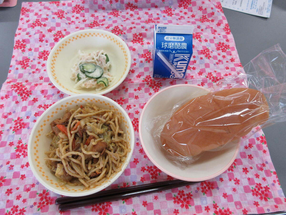 今日の給食は、ミニコッペパン、焼きそば、大根サラダと牛乳でした。