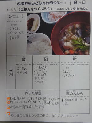 次回は、2月の朝食(味噌汁)作ろうデーになります。豪華でなくて構いません。ごはんと味噌汁と納豆など無理なくできるものでいいです。そのうち、お子さんに「ごはんつくるよ!」なんて言ってもらえるようになると嬉しいですね。