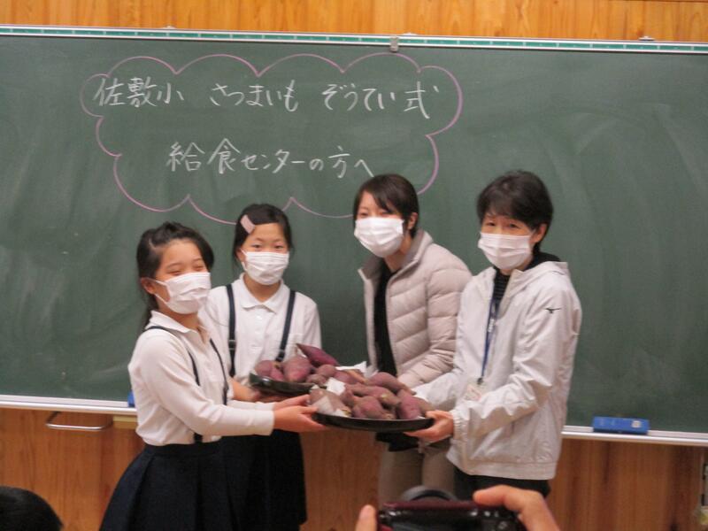 夏にJAの方に植え方を教えていただいたさつまいも。先日収穫したのですが、雨が多かったことが影響してか、子ども達が期待するほどの量ではありませんでした。今回は、みそ汁の具として使っていただくことになり、3年生が代表で給食センターの方にさつまいもを贈呈しました。12月10日の給食が楽しみです。