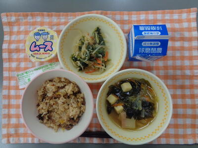 献立:ビビンバご飯、わかめスープ、もやしとほうれん草のナムル、ムース、牛乳