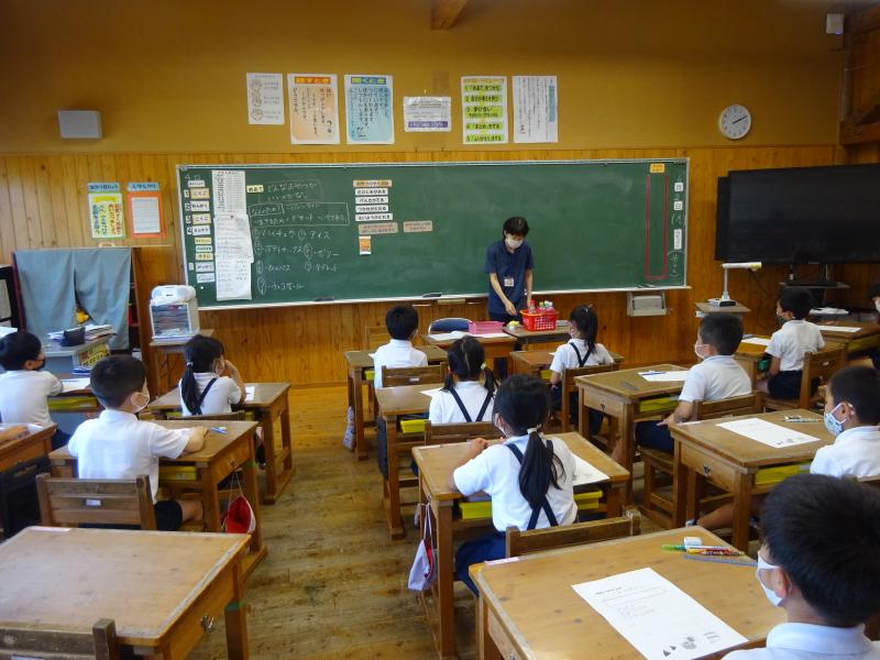 外国語活動の時間はいつも大盛り上がり・・・今回は1学期に学習したことをクイズ形式にして復習しました。グループで 問題を選び、答えられたら色のついたカードを1枚引きます。それに書いてある点数が自分たちの得点になったり、他のチームから得点を奪えたりするので、子ども達はドキドキわくわくが止まりません。夏休みには、身についたあいさつや数の数え方を使って会話ができる機会があればいいなと思っています。