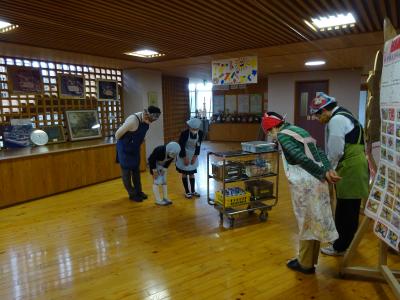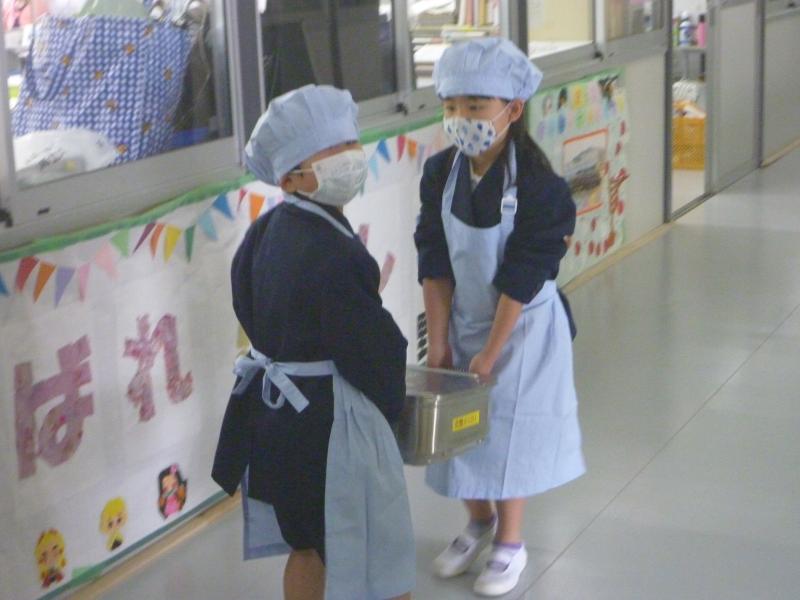 給食コンテナを校長室前に置くことができませんので、職員が事前に給食をワゴンに乗せ、エレベーターを利用して2階に運んでおきます。6年生の2学級は8名程の児童が2階エレベーター室前の棚から給食を運ぶ必要がありますが、他の学年は、写真のとおり少人数で運ぶことができます。