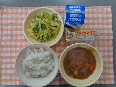 献立:麦ごはん、ポークカレー、フレンチサラダ、米粉ドッグミニ、牛乳